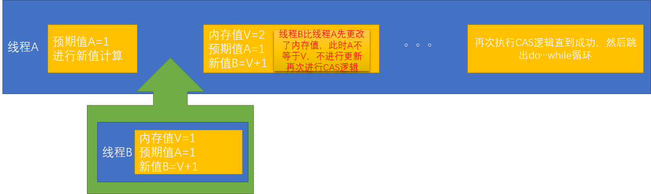 更新规则当且仅当预期值A和内存值V相同时,将内存值V修改为B,否则什么都不做。其实就是拿副本中的预期值与主存中的值作比较,如果相等就继续替换新值,如果不相等就说明主存中的值已经被别的线程修改,就继续重试。